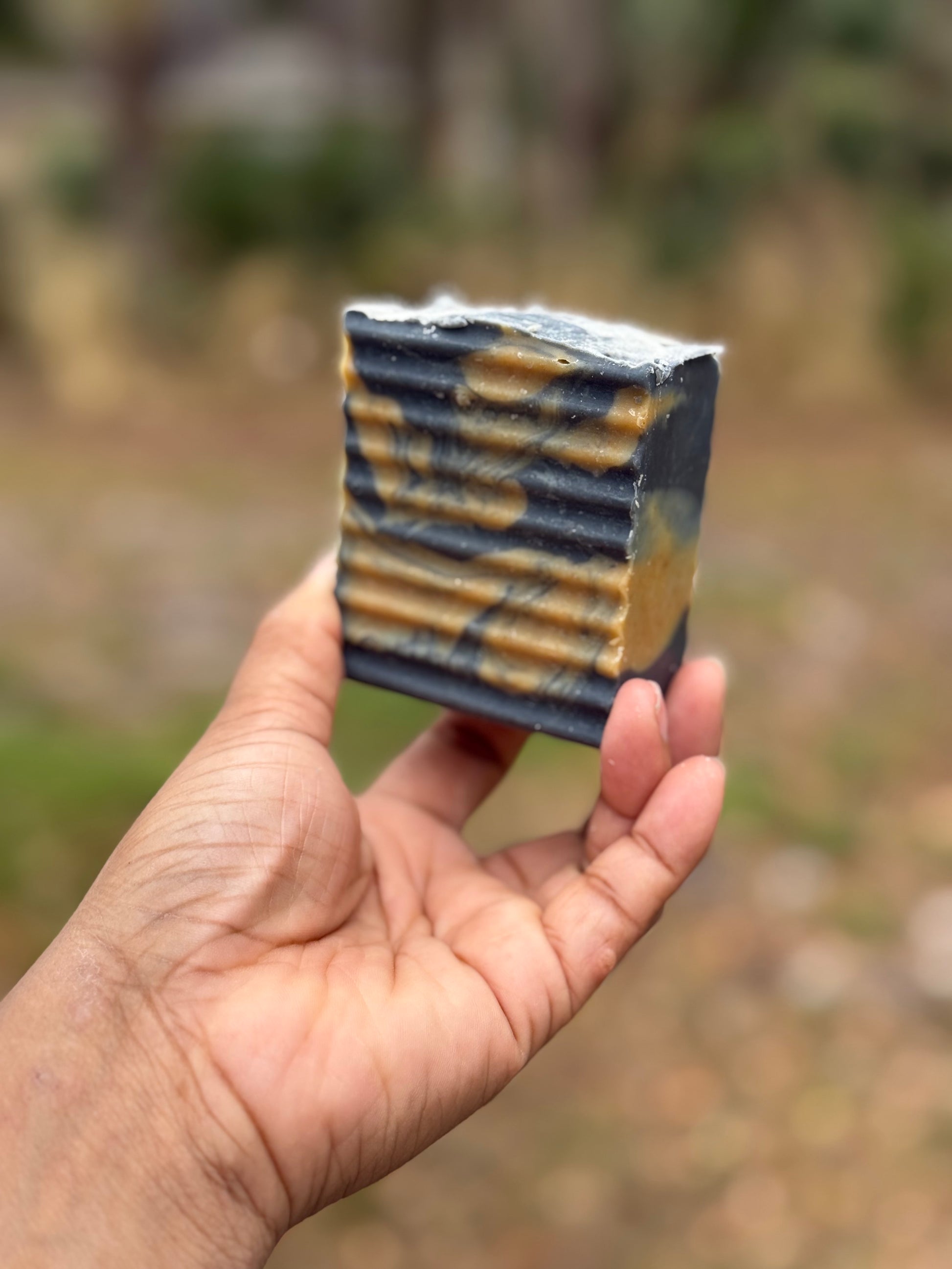 GOODIES USED- Distilled Water, Lye, Shea Butter, Mango Butter, Coconut Oil, Grapeseed Oil, Jojoba Oil, Sunflower Oil, Olive Oil, Activated Charcoal, Turmeric, and Honey.