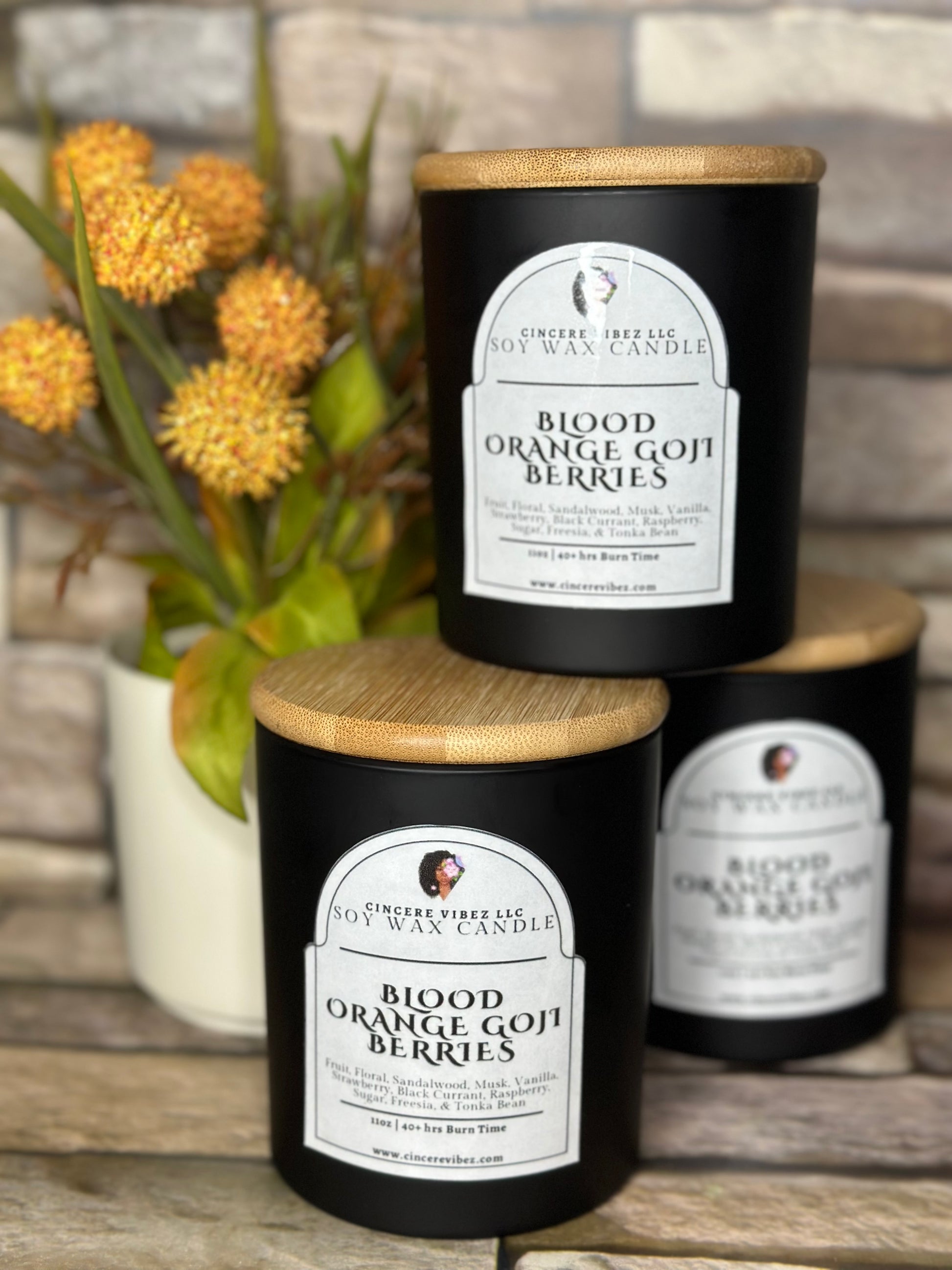 NATURAL SOY CANDLE: Blood Orange & Goji Berries is a perfect marriage between fruit and citrus. The fruit tames the deep blood orange, giving you an exotic tropical delight! Here’s to exotic notes of Blood Orange, Fruit, Citrus, & Goji Berries.